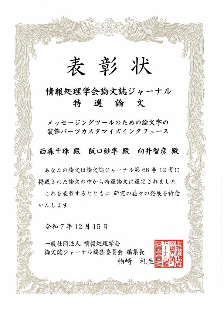 情報処理学会論文誌ジャーナル特選論文 Posted on 2026-01-152026-01-16 by Tomohiko Mukai情報処理学会論文誌 Vol.66, No 12に掲載された論文「メッセージングツールのための絵文字の装飾パーツカスタマイズインタフェース」が情報処理学会論文誌ジャーナル特選論文に選出されました。これは情報処理学会論文誌ジャーナルの各号に掲載された論文のなかから、きわめて優れた研究成果があって、多くの人に読んでもらうことが推奨される論文に対して付与されるものです。本論文の著者は2024年度博士前期課程修了の西森千珠さん、阪口紗季助教(現 東京都市大学准教授)、向井智彦教授です。